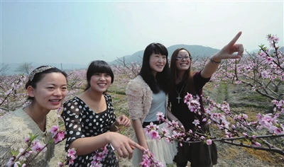 连日来,桐屿街道丁前、杜岙、中后村一带的千亩桃花争奇斗艳,前来踏青、休闲、观光的市民络绎不绝。图为一群少女在郊外观赏桃花。 本报记者 王保初 摄