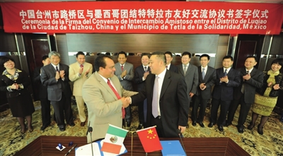 5月21日下午,我区与墨西哥团结特特拉市友好交流协议书签字仪式在鑫都国际大酒店举行。区委副书记、区长徐仁标和团结特特拉市市长塞尔西奥·蒙铁尔·梅西亚在友好交流城市协议书上签了字,并互赠礼品。双方还进行了交流座谈。区人大常委会主任蒋临,副区长李震杰及相关部门负责人参加。本报记者 王保初 摄