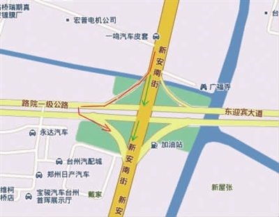 这里,就是原杨戴大转盘,即迎宾大道和新安南街的交汇处,在该处有着极为显眼的红绿灯来维持交通秩序。西起路院一级公路,往东可上路泽太一级公路、东方大道、椒新线等主要干道,终至机场;新安南街在路桥客运南站与104国道融汇,104国道是过境公路,往南通往温岭市,沿途分布着大大小小的村镇。因此这里成了路桥客运南站发往温岭方向巴士的必经之处。