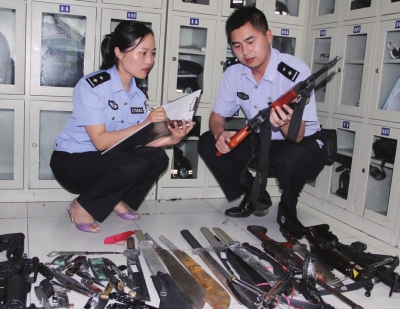 6月11日上午,民警在清点收缴的枪支弹药、管制刀具等物品,并进行登记造册。连日来,路北派出所民警结合“三访三评”工作向辖区群众宣传涉爆、涉枪等违法犯罪的社会危害性,全面收缴流散社会的枪支、弹药、管制刀具等物品。本报记者 王保初 通讯员 吴苏青 摄
