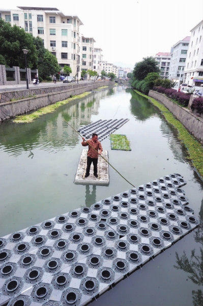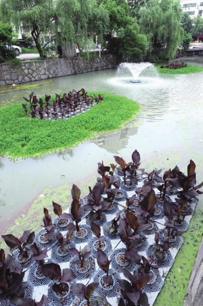 在路北街道赵王泾620米长的河道上,共铺设了1896平方米的挺水植物浮床和216平方米的浮水植物浮床。目前,生态浮床上共栽种了美人蕉、千屈菜、旱伞草等挺水植物,以及香菇草、狐尾藻等浮水植物。这些植物能够利用自身根部的吸附作用,将水中氮、磷等污染成分去除,达到逐步净化水体的目的。