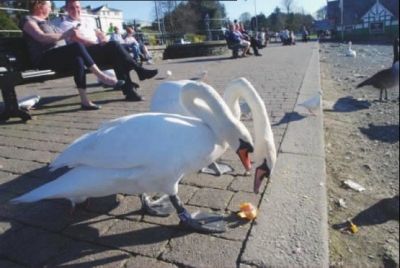 湖边的鸭子和海鸟悠闲地散步或晒太阳。它们一点都不怕生,即使是走到它们身边,甚至抚摸它们。它们也热衷于人们喂的一些面包片或冰淇淋蛋卷。