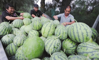 6月20日上午,台州市农垦场一分场瓜农许昌军家人,喜滋滋地将刚采摘下的“黄蜜”牌西瓜筛选装车,并以每公斤3.6元的高价销往市场。农垦场党委委员吴锡法说,连日普降大雨,不少地区涝情严重,许多瓜田被淹,瓜农损失巨大,而农垦场的2000多亩西瓜丝毫无损全靠排涝工程的功劳。近年来,该场投入2000余万元改造近万亩低洼田,并将河道全面疏通、砌石,水渠硬化,建设排水泵站等,大大提高了排涝能力。 本报记者 王保初 摄