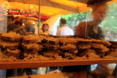 一进门就可以看到各种各样卖盘子、碗的摊位,非常吸引人。各种动物构成了盘子底儿的印花,这样是不是做什么菜就放到哪个盘子里呢?各种味道的酱料装在瓶瓶罐罐里,前面一排都是打开的,中间小筐里放着切好的面包,可以先尝后买,多么的返璞归真。市场内还有来自不同国家的橄榄油,口味极佳的蘑菇酱,蛋糕和布朗尼,卖牛肉的摊位,腌制过的各种味道的橄榄,西班牙桑格利亚果酒等。