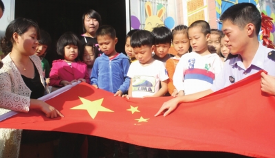 日前,路南派出所社区民警来到小小幼儿园,向小朋友们讲述国旗、国歌、国徽等知识,旨在让小朋友从小树立爱国爱家的情怀。 本报记者 蒋友亲 摄