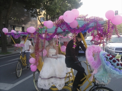 日前,城区一对新人举办婚礼,新郎没有请豪华的迎亲车队,而是租了8辆人力三轮车,接新娘进门。长假期间,许多新人选择简朴环保型的婚庆方式为自己打造有意义的低碳婚礼,成为街头一道独特的风景。 本报通讯员 陈林聪 摄