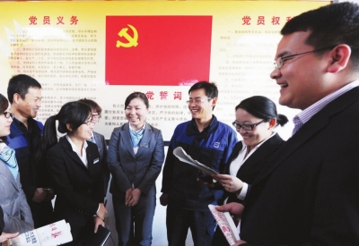 11月12日中午,路南街道方林汽车城4S党员服务中心的党员们在兴致勃勃地交流学习体会。为保证工作、学习两不误,当日,该服务中心专门利用午休时间组织全体党员,开展学习和讨论“十八大”报告精神。 本报记者 王保初 摄