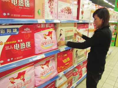 虽然离保暖御寒商品的销售高峰还需要一段时间,但市区各大超市已将取暖器、保暖内衣、电热毯等取暖商品陈列在超市最显眼的位置,迎接销售高峰的到来。图为峰江某超市内的一名顾客正在选购保暖商品。 本报通讯员 蒋行斋 摄