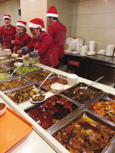 随着圣诞节的来临,我区各商场、饭店等场所纷纷营造节日气氛。图为某快餐店内员工为烘托气氛,带上了圣诞帽。本报记者 项懿 摄