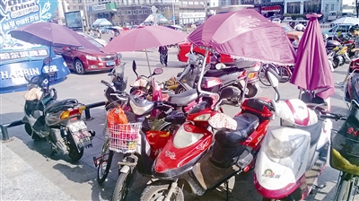 在台州市客运南站门口的非机动车停放处,记者发现安装着遮阳篷的电动车很多,有的车主停放好车辆后将伞收拢,但是一些敞开篷的电动车则占据了很大的停车空间,造成其他车辆停放不便。