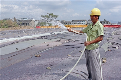 为了防止因暴晒、风吹、寒冷等令路面出现不正常收缩、裂缝等破损现象,张于友需要在1个星期左右的时间内,不时地为路面浇水养护,工作虽不繁重,却常常得在阳光下曝晒一整天。