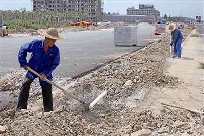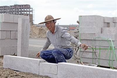 “今天天气还算好,不如前两天热,这几天晒下来也习惯了。”35℃的户外温度对莫辉志来说已是上天的“恩赐”,但他的汗水还是将褐色的上衣浸润成了深咖啡色。头上的斗笠,遮住了他身上唯一裸露的部分——脸,但遮阳效果并不好,帽檐下的皮肤黑得发亮。
