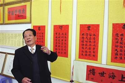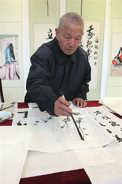 梅兰竹菊的四首小诗,敬老爱幼的“三经字”……这些颇具风格的书法作品皆出自眼前这位82岁的罗邦辉笔下。