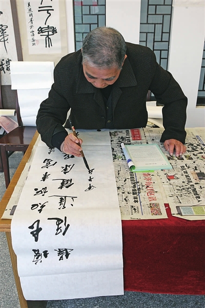 “去年年末镇宣传办组织了一次送春联活动,邀请了我们这些会写的,还有横街镇中小学的学生和退休干部,共二三十个人去现场,场面很热闹。结果,要春联的人太多,整整站着写了一上午,累得我腰直了。”潘学富呵呵地笑了笑,不过这样的累,他还是相当“熟悉”的,因为早在许多年前,他就靠这门手艺卖过春联。“只要我卖春联,生意自然要比别家好许多,可这也麻烦,直到年三十晚饭时间都还有人等着要,总不能让他们等着。”潘学富只好一一满足每个人的要求,而等到最后一个顾客走时,往往已是春晚开始时分。因为吃不了一顿热乎的团圆饭,他狠了狠心,放弃了能赚些零花钱的机会。