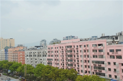 随后,记者赶到西路桥大道,发现该路段164号至218号的街面墙体确实是一片粉红色。记者在现场看到,该区域墙体安装空调外置机箱的部位都装了由白色栏杆拼成的格子,墙壁表面所刷的粉红色比较新,且色调偏亮,和白色的横格搭配,视觉上有些突兀。相比之下,粉色两旁的白色楼房显得有些暗淡、发黄,格格不入。