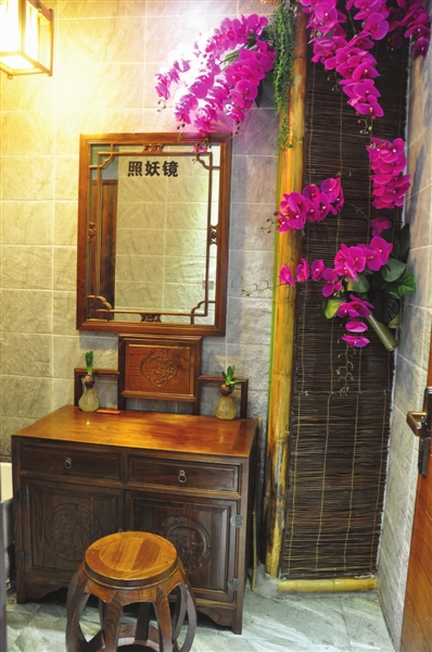 与此同时,山庄内的菜品价格十分实惠,人均不到100元的消费在物价飞涨的如今还是相当有吸引力的。另外,庄内还有一处特别有意思,那就是卫生间的设计,不对,应该称之为恭院。恭院又按男女分为观瀑亭与听雨轩,木质的梳妆台镜子上,赫然贴着“照妖镜”三字,令人忍俊不禁。