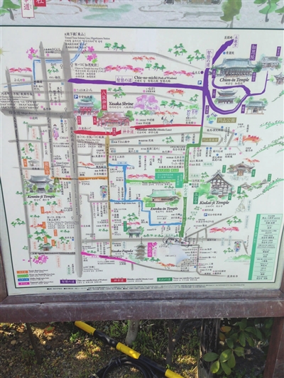 酒店前台都会放置出行指南,根据指南可以轻松找到相应的交通方式。原以为语言不通,使用大众交通工具会有诸多不便,当看到车站的站牌后,这种顾虑就完全消除了。几乎所有站名都是用中文字写的,上车后看到指示牌提示站名下车就好。另外,乘坐公交车需要购买一日券或者投币,乘坐铁路需要在站牌上看好到达目的地所需要的金额,在自动售票机上选择相应金额购买即可,这种选择金额而不是选择目的地的售票方式,方便简单。走在大街上,路牌也多数是中文字,景点地带有很多路牌,让游客时刻了解自己的方位。值得一提的是京都的红绿灯,复古的造型,在充满历史感的城市里显得十分亲切。