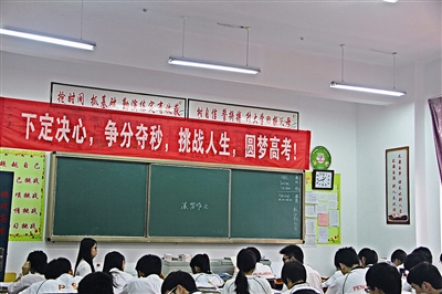 高三楼门口的对联格外引人注意,“今朝滋德润智成大器,他年纬地经天谱春秋”读来很是励志。再往里走些,黑板报上早已没有五彩缤纷的图画,剩下的只是“高考倒计时”和一些考前注意事项。左右两面墙上张贴着横幅,上面写着考生们对高考的承诺,那是3个月前高三学生们在高考百日冲刺宣誓大会上许下的,他们在上面签下自己的名字便意味着高考迫在眉睫了。各个班级的外墙上也张贴着各类“标语”,高三共13个班级,每个班级的“标语”都不一样,写着考生们的豪言壮语与理想。