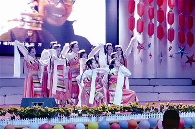 舞蹈、独唱、诗朗诵、小品等节目轮番登场后,妈妈们也不甘落后,手持拐杖,上台跳起了爵士舞,动作虽有些生疏不到位,但劲头丝毫不减。孩子们熟悉的还有每日朝夕相处的生活老师们,从未上台表演过的她们,却正儿八经地身着藏袍,伴随着《天路》的乐曲声,演绎着异域风情。