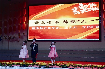 “让爱天天住你家,让爱天天住我家,不分日夜秋冬春夏,全心全意爱我们的家……”记者寻着《让爱天天住我家》的歌声找到了蓬街私立小学“六一”文艺汇演的大会堂。
