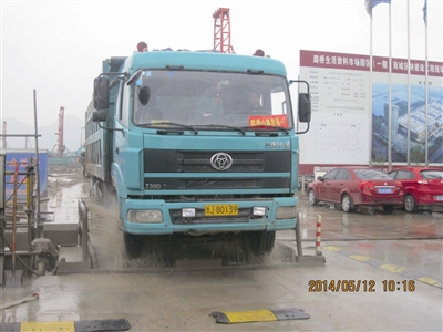 经过门口的时候,先从水池里清洗一下四轮,然后用高压水枪自动冲洗过往车辆的前轮、后轮,再过一遍清水,最后人工冲洗车厢和挡板。看完这句话,你可千万不要以为是在洗车店,这是记者在台州客运中心(南站)看到的工程车出施工现场时的一幕。