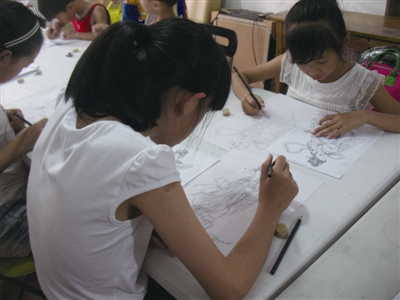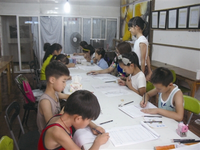而随着暑假的到来,各种兴趣班陆续开课。近日,妙智街附近的书法、美术、乐器等培训班正如火如荼地开展着,孩子们或画素描,或画幼儿画,或专心致志地听着课。“平时周末也有学生来上课,但每到暑假,来学习画画的学生特别多。”据翰耕画室路桥教学点的负责人罗普建介绍,这个教学点的学生主要是针对城区的孩子,而为了方便城区周边孩子学习,学校还在横街镇、蓬街镇、路北街道三地开设了教学点。除了美术课外,翰耕画室还开设了书法课,并在中午进行作业辅导,上课时间为早上8点半到下午3点。至于学费,则随着学习内容的不同有所调整,如美术是1000元,书法是900元,美术+书法是1700元,美术+书法+作业辅导则是2000元。