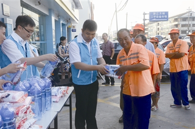 8月8日下午,台州银行石曲支行和路南街道团委联合组织开展“关爱环卫工人 夏季送清凉”活动。当天,石曲支行的志愿者们准备了毛巾、茶杯等慰问品,给路南街道的250多名环卫工人送去慰问与关怀。本报记者 李林峰 实习生 李哲 摄