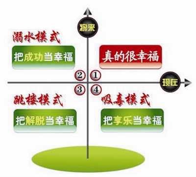 这个幸福的度该如何衡量呢?教育专家郑委曾通过横纵坐标诠释过“幸福”的定义,是有一定的道理的,在这里跟大家分享一下。如图:第四象限的人把享乐当幸福,不考虑将来,没有目标,醉生梦死,今朝有酒今朝醉;第三象限的人把解脱当幸福,没有将来也没有现在,没有活在当下,同样也没有目标,得过且过;第二象限的人把成功当幸福,有着远大的目标,有孜孜不倦追求的动力,但不享受当下,成功固然幸福,但这种幸福转瞬即逝;第一象限的人才真的幸福,享受当下,也有追求的人生目标。