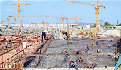 据工程负责人介绍,目前现场共有施工人员近500人,作业车辆60余辆。为加快进度,接下去还会增加人工以抓紧作业。截至10月20日,综合办公用房区块,完成挖土7万余立方米,完成率100%,基础底板施工已完成84%,地下室工程完成总量的46%, 计划年底前建至5层楼面。市场区块,土方开挖已完成约53万立方米,占总土方79万立方米的67%,基础底板已经完成10.8%,地下室工程完成6.7%,计划年底挖土完成95%,基础底板完成80%,地下室工程完成50%,地面工程完成5%。