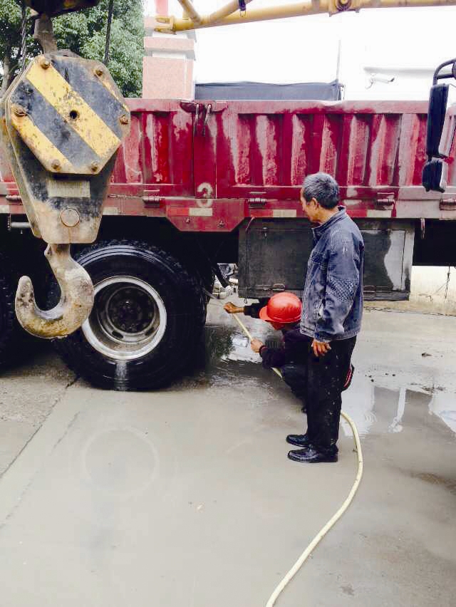 | 11月27日,某工地的洗轮机部分出现故障,工地工作人员改用水枪冲洗车轮。本报通讯员 陈青海 摄 |
