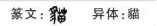 原来,在汉代以前,我国并没有真正意义上的家猫。尽管《诗经》中有“有熊有罴,有猫有虎”,《礼记·郊特牲》中有“迎貓,为其食田鼠也”等关于猫的记载,但那都是生活在野外的野生猫,别名豹猫、石虎,与熊、虎等一道归入猛兽之列。人们迎接猫、祭祀猫并不是出于对猫的喜爱,而是出于对农业生产的重视,因为这种动物喜食老鼠,能保护庄稼免受鼠害。猫的名字由来,就和这一特点密切相关,你看“猫”(或作“貓”)字,左为“犭”或“豸”,表明是兽类,右为“苗”,即禾苗庄稼,合二为一,不正显示着这是一种能保护庄稼的野兽吗?加之这野兽经常发出“喵喵”的叫声,读音上也就自然称之为“猫”了,在古代,猫有一读音为“眉骄切”,即miāo。