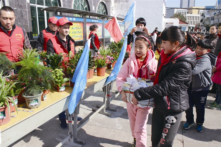 一盆盆贴着“节约纸张 人人有责”的盆栽在“红马甲”们的安排下,分类摆放在操场一角,就在他们忙碌的同时,围拢过来的同学们不停地问着:“老师,这要多少纸才能换一盆花啊?”“老师,明天活动还搞吗?”……12月22日中午,位于路北街道管前村的蓝天学校,比平时热闹许多,彼时,环保分局和慈善义工分会的环保志愿者们在这里举行“废纸换盆栽”活动,吸引了全校师生参与。