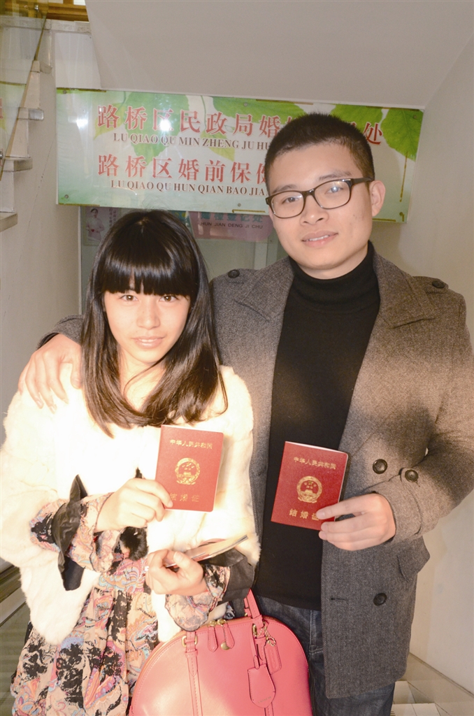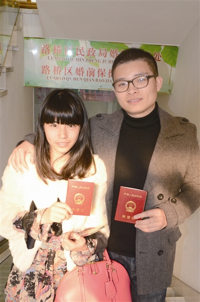 昨日是圣诞节,不少情侣选择在这一天步入婚姻殿堂。刚领到结婚证的柯先生和李小姐很是激动,柯先生说:“看了黄历今天日子不错,而且又比较好记,所以就选定这天登记。”本报记者 王 挺 摄