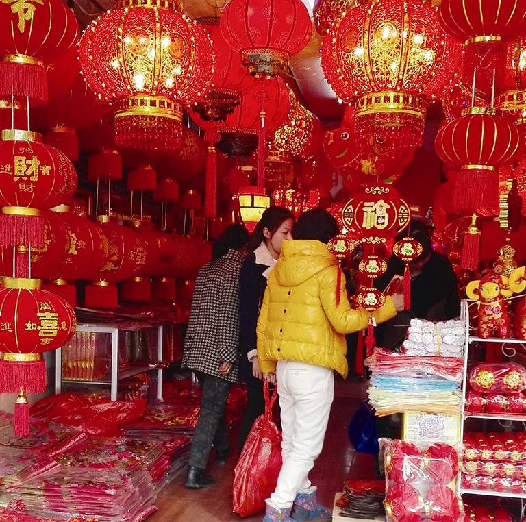 春节将至,市民正在小商品批发市场附近的一家商店争相购买大红灯笼,为家里装扮节日的气氛。