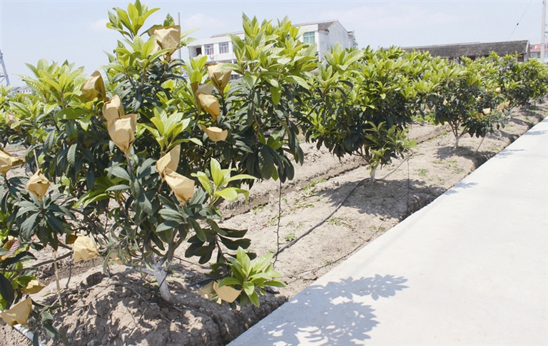 信步而入果园,水泥道路两侧,成片的枇杷树上,每一个果实都已经套上泛黄的纸袋。当下正是枇杷生长的时节,如此处理也是为了能让果实再长好一些,还能防虫害,是果农们长期积累的种植经验。再过个把月,这批枇杷就可上市,果农们满心期盼能有一个好收成,卖出好价格。