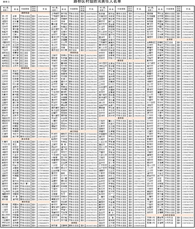 台州市路桥区人民政府防汛防台抗旱指挥部关于印发小型水库、村级防汛责任人名单的通知
