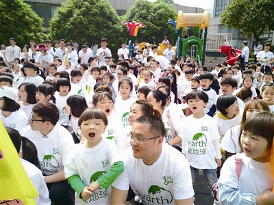 “大朋友、小朋友,我们的口号是……?”“大手牵小手,文明一起走!”“关爱我们的地球妈妈!”4月17日上午,水天一色幼儿园的室外活动场地上,彩旗迎风猎猎招展,人头扎堆挤挤挨挨,口号声此起彼伏,清脆响亮的嗓音中不时拖出几个稚嫩的尾音。