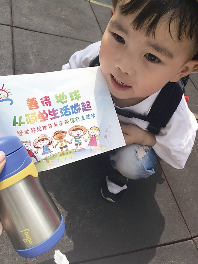 门口长长的红色条幅上,“水天一色幼儿园‘善待地球·从简单生活做起’暨世界地球日亲子环保行走活动”几个醒目的大字与场内每个人身上的白T恤相呼应,“关爱地球”的绿色字体将人们的面容辉映得格外精神。