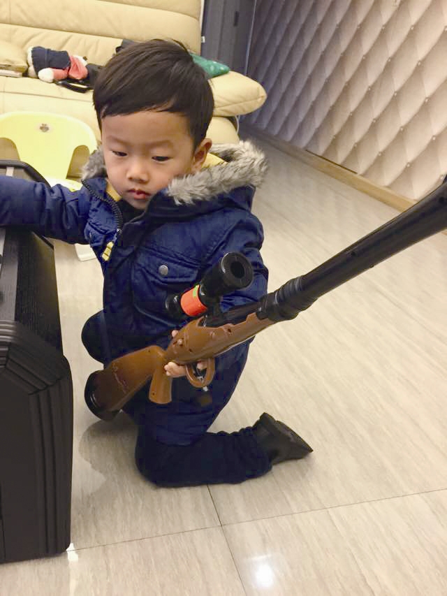 睡前要摸一摸手枪,醒后立马开口要枪,这就是LULU的独特个性。他总是对自己喜欢的东西爱不释手,半年下来未曾改变。近两个月,LULU的表达能力又变强了,他会开始向我表达,想要什么样的枪,比如说,想要能支撑在地上的枪,能够给花花草草浇水的枪……每个星期我都会打开淘宝网,先是问问家里的手枪“收藏家”,到底要啥款式之类的,再购买。