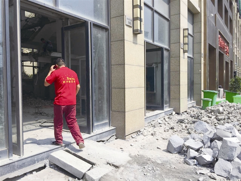 | 执法人员加大对考点周边生活噪声的查处力度,尤其是房屋施工噪声的查处。图为一处店铺在装潢时因声音太响被暂时叫停。