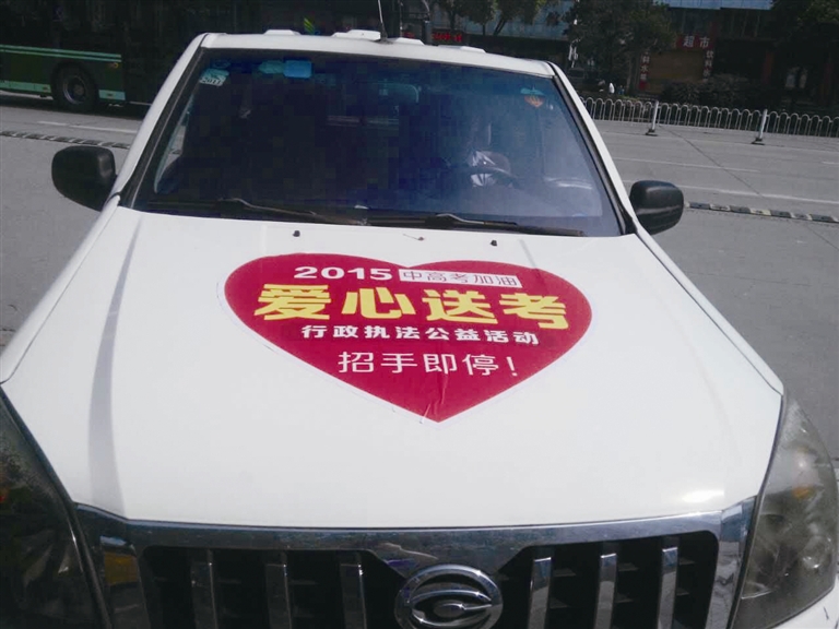 | 城管执法车再次成为“爱心送考车”,考生看到贴有这样标志的车辆可以享受招手即停的待遇,并且免费送到考场。