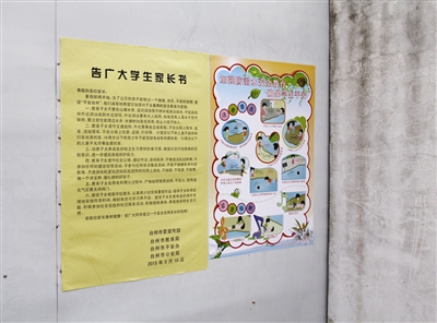 除了宣传栏上详细的安全宣传知识,该校还在校门口附近张贴了生动的防溺水宣传画,旁边附上了一封“告广大家长的一封信”。这一系列的宣传载体,目的只有一个,那就是全面营造安全防范的氛围,让众人在潜移默化中接受安全熏陶。