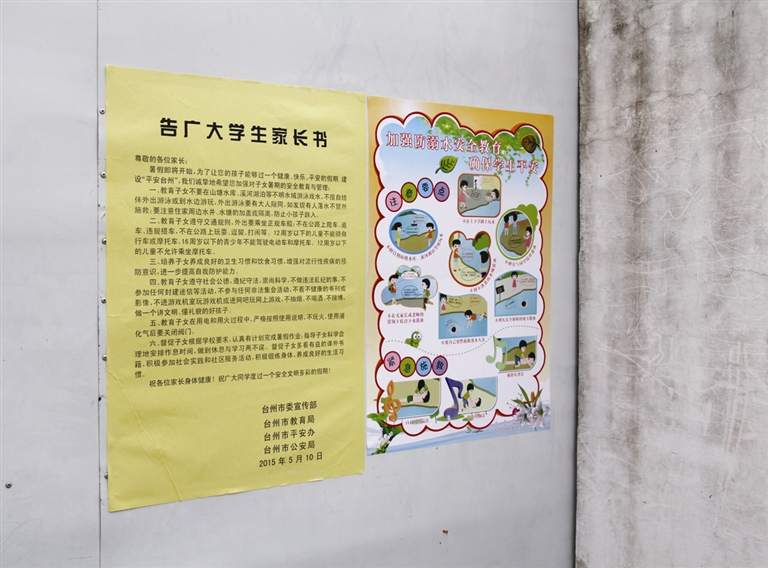 当然,除了防溺水,其他一些安全防范工作也不能忽视。“暑假期间,班主任会每个星期通过‘校讯通’给家长群发短信,提醒他们近段时间要注意的一些安全内容。比如,8月份台风季的时候,我们会及时提醒家长多注意防汛防台,更加注意孩子的安全监管。”陈建华坦言。