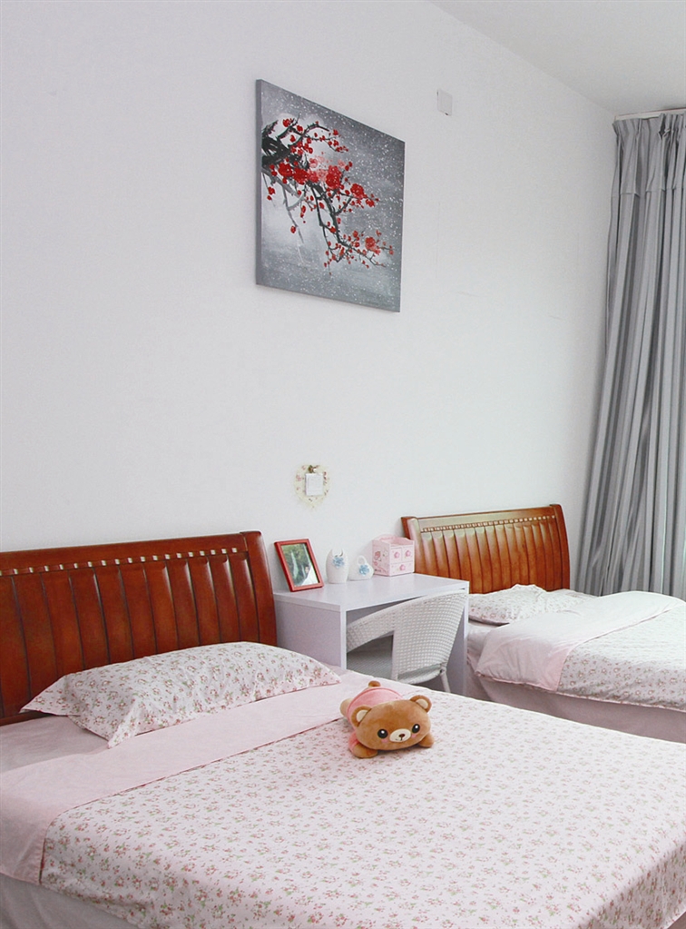 楼梯口正对着女民警周玲的宿舍,她选择的是红色格调。她说,红色象征着热情、快乐,象征着激昂、热烈,象征着奉献、希望。走进房间,满眼的姹紫嫣红,给人的第一感觉就是春意盎然,生机勃勃,全身的血液都被唤醒,无形中激发了自己的工作激情。周玲的房间里,一幅红梅傲雪图格外引人注目,画面的背景是一面空荡荡的白墙,象征着冬天的大地,众芳凋零,只有铮铮铁骨、坚强不屈的红梅依然俏丽绽放。这恰巧展现了警察的勇敢、坚强和奉献。