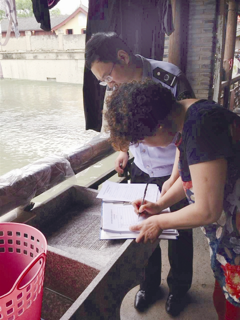 7月中下旬开始,行政执法分局路桥中队对十里长街沿河住户私自搭建水槽等构筑物进行专项整治。图为执法人员分发责令限期整改通知书。
