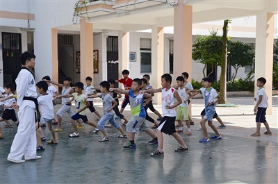 “尊师重道,崇文尚武,先德后武。”横街中心小学教学楼间的空地上传来阵阵呐喊之声,气沉丹田,落地有声。三年级的学生家长紫龙(化名)爸爸正带着20多名孩子进行热身运动。习武多年的紫龙爸爸是家长志愿者,为乡村少年宫的孩子们教授太极。