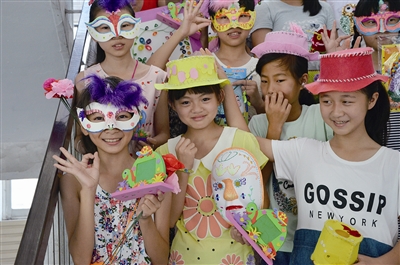 “阿姨,你头上戴着的发夹,我们也会做。”即将上四年级的林珂萱指着记者头上的发夹说道,她告诉记者,在这个假期,她还为妈妈制作了脚链。“这是我上节课做的面具,还有帽子。”林珂萱一边说着,一边掏出了一大袋完工的作品,“你看,我戴着好看吗?”