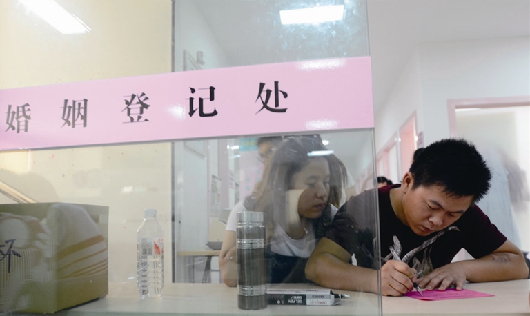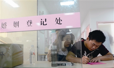8月20日,一对对新人来到婚姻登记处注册登记。昨天是农历七月初七,是牛郎与织女鹊桥相会的日子,很多年轻人喜欢选择这一天结婚登记。昨天10时30分,来办理婚姻登记的新人也就30多对,工作人员半开玩笑地说:“这是个好现象,说明现在的年轻人开始回归理性了。”