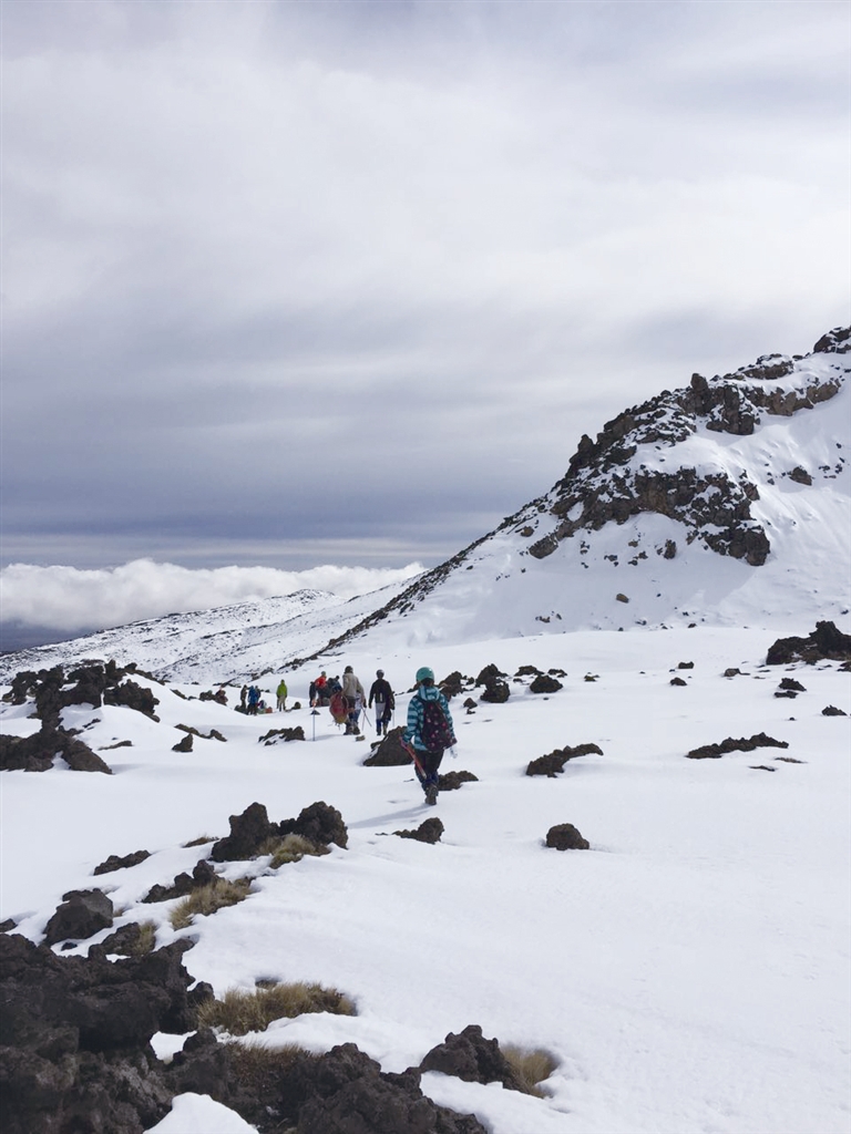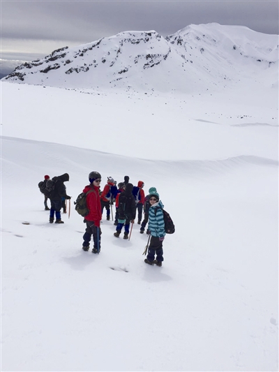 我们继续往上爬了一阵子,来到一小块平地上,向导让我们停下来整顿衣服,并教授我们如何使用登山镐,告知我们在身体下滑时要及时减慢速度尽量停下来等注意事项。随后,我们拿出背了一路的冰爪鞋,把它穿在登山鞋的外面。冰爪鞋的鞋底是沿着鞋的轮廓伸出来的一个个“爪子”,每走一步都能让脚牢牢地抓到雪地里,所以行走时稳固许多,再也不怕滑了,而且在登更高更陡的雪坡时抓地力也更好了。唯一让我觉得不好的是,冰爪鞋非常重,因为它除了捆绑的带子以外其他的都是金属。