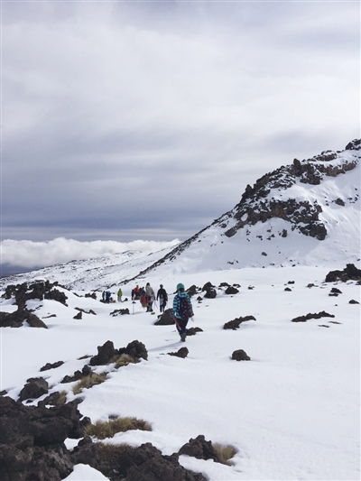 冰爪鞋的绑法很讲究,一根长长的带子要从哪里穿过,从哪里绕出去再从哪里扣起来,多出的部分塞到哪里……这些都来不得半点马虎。我们在向导的一步步教授下绑好鞋带,确保它已经牢固地贴合着我们的登山鞋。所有都准备好后,我们继续出发。接下来走的都是有坡度的雪山,踩起来脚会滑下去,因此走起来更为费力。而穿上冰爪鞋后,向导要求我们要像鸭子一样走路,就是脚要抬高,平移着向前走,这个姿势只有走过的人才知道有多累。